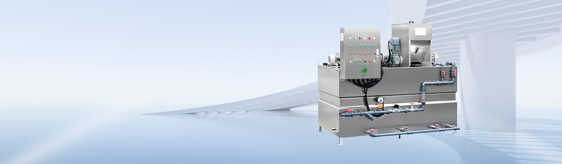 料斗中的粉狀劑經定量供料裝置送入混合器中,與水進行混合后進入溶液箱中,混合液經攪拌后形成均一濃度的溶液,再進入貯液箱內,經計量泵投加至加點。
