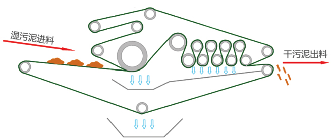 工作原理:通過對含水率80%左右的污泥進(jìn)行化學(xué)調(diào)質(zhì)改性處理后再高壓擠壓脫水至含水率60%以下,KTSD壓濾脫水機(jī)是由上下兩條張緊的濾帶夾帶著污泥層,從一連串有規(guī)律排列的輥壓筒中呈S型經(jīng)過依靠濾帶本身的張力形成對污泥的擠壓和剪切力,把污泥層中的毛細(xì)水?dāng)D壓出來,獲得含固率較高的泥餅,從而實(shí)現(xiàn)污泥的脫水。